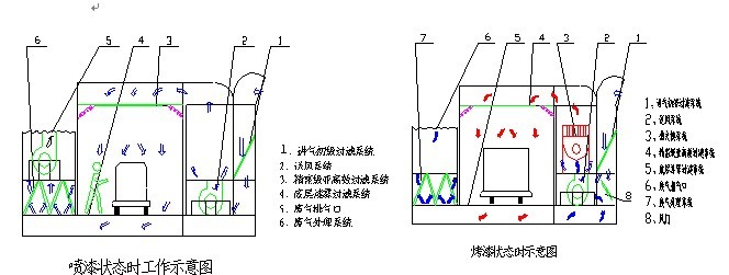The outdoor air is filtered through the primary filter screen (the air should be heated for operation in winter), sent to the top of the baking booth by fan, further filtered and cleaned through the filter screen at the top, and then sent to the booth, in which the air is all down, flowing downward at a certain speed, preventing the paint fog particles from staying in the air, and making them directly go into the outlet filter unit at the bottom, thus to eliminate over-sprayed paint fog and harmful gas generated in paint spraying. The treated waste gas will be exhausted directly out of the booth from the exhaust vent, thus to ensure the absolute freshness of the air in the booth, creating a safe and hygienic working environment.