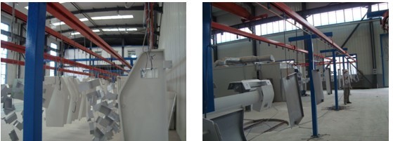 The coating line is composed of seven parts, including: the pre-treatment equipment, the powder spray system, the paint spray equipment, the bake oven system, the heat source system, the lighting system, the electric control system, and the suspension conveying chain.