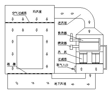 烘干工作原理图,传统的烘干室采用风管输送热风局部循环方式,我公司自主研究开发。开发出热风循环不间歇过滤方式,在烘干的状态下,室内的压力为微正压;加热方式有电加热、燃油加热、天然气加热、红外加热,加热的空气在风机的作用下,到达均风过滤层进行过滤,热空气进入室体内部对漆膜进行加热,在引风机的作用下温度下降的空气经过风机进口过滤层的过滤,重新进入燃烧室体进行加热循环。一小部分空气通过废气处理管道作用进入废气处理单元进行处理,经过充分燃烧,最终的气体为二氧化碳和水,排入大气。