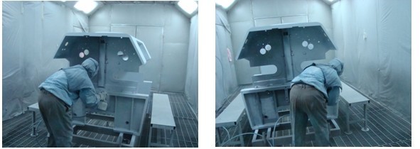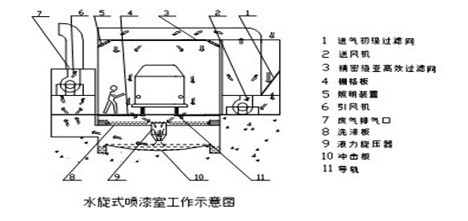 喷漆室在工作状态下,由空调送风机、排风机、循环泵启动。将室外新鲜空气由进风口经过Ⅰ级净化,通过空调送风机将被净化的空气送入动压室,动压室内设置导流板和分流器,使空气能均匀流向静压室,静压室底部的过滤顶棉对气流进一步进行均压,阻截固态尘埃。清洁空气呈层流方式进入室内,在工作周围形成有序气流,使喷漆剩余漆雾不向四周弥散,以保护操作者的劳动安全。在气流的作用下,气流有序地通过水旋器,利用水旋器将水雾化成细水珠的漆雾空气进行洗涤,以达到净化空气的目的;在喷涂过程中产生的喷漆雾,在送风系统的层流作用下,由排风机强制通过水旋器,经洗涤、冲击后,漆雾被捕集,同时在油漆凝聚剂的作用下,凝聚成块,定期打捞;水循环使用。