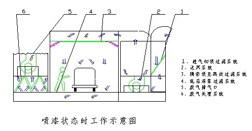 干式喷漆房工作原理:外部空气经初级过滤网过滤后由风机送到喷漆房顶,经均流调节器调节和通过顶部精密级亚高效过滤层后均匀地被送到室体内,以层流方式自上而下流动,此时空气含尘量≤1.5mg/m3,最大颗粒直径≤5μm。工件被置入具有一定风速的均流层中,使喷漆时飞溅的废雾压入底部过滤器收集处理,室内过喷漆雾和喷涂过程中挥发的有机气体,被迅速吸入格栅下部的漆雾处理系统:玻璃纤维过滤毡去除部分漆雾,活性碳净化器去除气流中的有机溶剂,处理后的空气在排风系统的作用下由排风风道排入大气,从而保证排出气体符合GB16297-1996《大气污染物综合排放标准》。